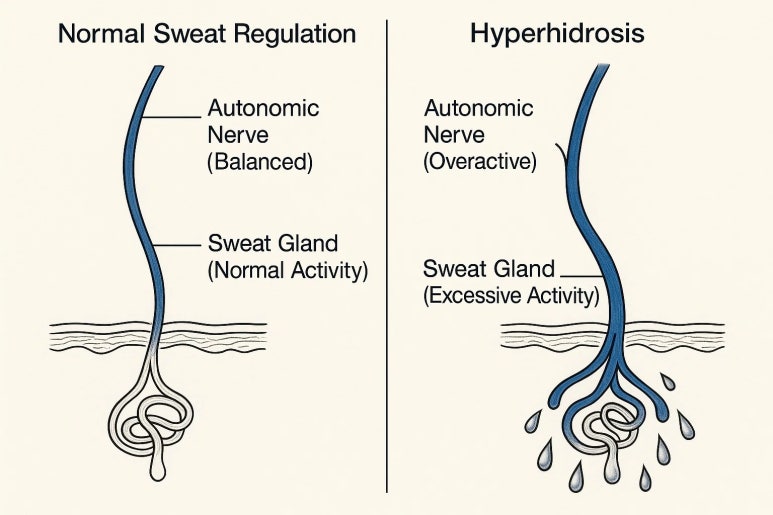 우리 몸의 `자율신경계`가 땀샘을 조절하는데, 이 균형이 깨지면서 땀이 과도하게 나는 것이지요.