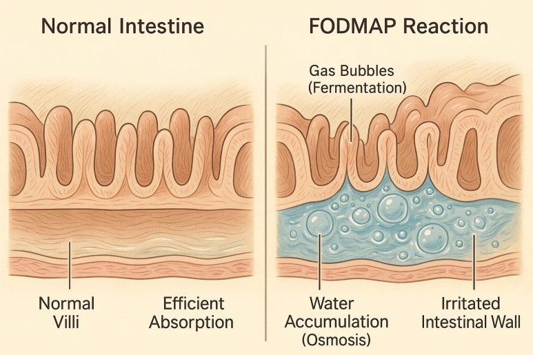 FODMAP은 장에서 잘 흡수되지 않고, 대장에 도달하면 장내 미생물에 의해 빠르게 발효되어 가스를 생성합니다.