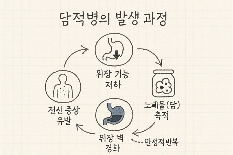 한의학에서 담적병은 위장 기능 저하로 인해 발생한 노폐물인 '담(痰)'이 위장 벽에 쌓여 굳어지는 병리적 상태를 의미합니다.