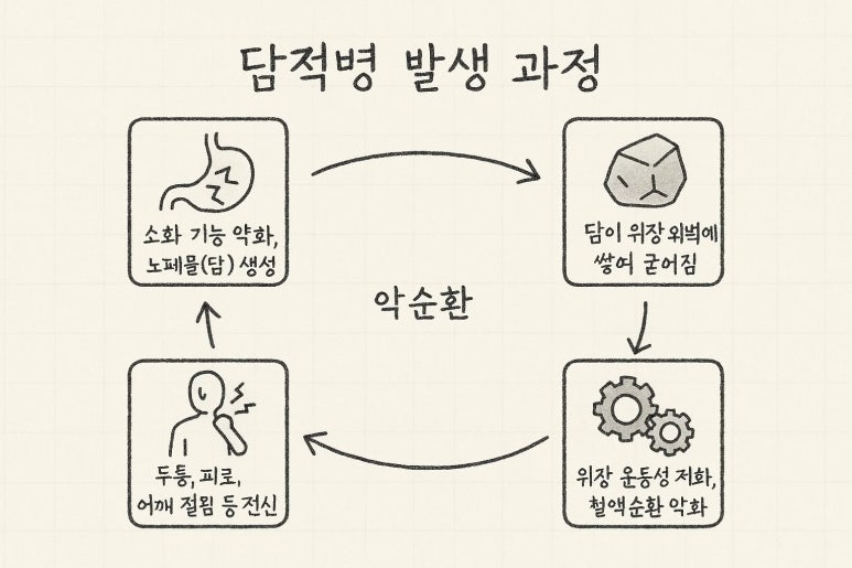 한의학에서는 우리 몸의 소화 기능이 약해지면서 음식물이 제대로 소화되지 못하고 끈적한 노폐물, 즉 '담(痰)'이 생성된다고 봅니다.