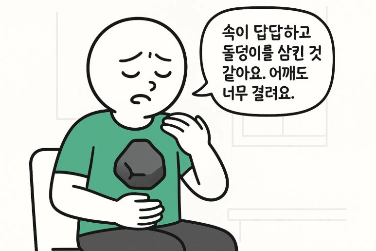 "아침에 일어나면 속이 항상 무겁고, 뭘 먹어도 소화가 잘 안 되는 기분이에요. 병원에서는 별 이상 없다고 하는데… 정말 지쳐요. 만성 소화불량과 위장병 때문에 매일이 고통스러워요." |