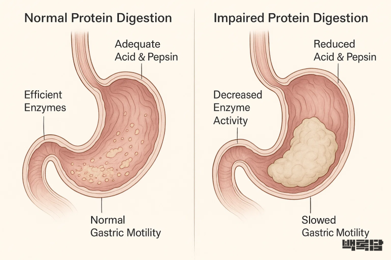 셋째, 위장 운동성이 저하됩니다. 위는 단백질 덩어리를 잘게 부수고 소장으로 이동시키는 펌프 역할을 합니다. 나이가 들수록 이런 위장 운동성이 떨어져 단백질이 위에서 머무는 시간이 길어지고, 이는 곧 속이 더부룩하고 소화가 안 되는 느낌으로 이어집니다.