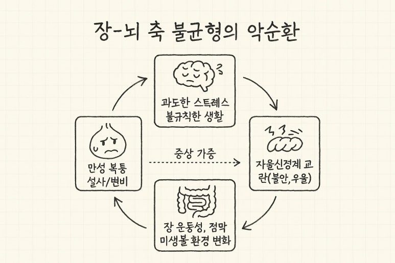과도한 스트레스, 불규칙한 생활 습관, 잘못된 식단, 오랜 기간 지속된 수면 부족 등이 몸의 자율신경계에 영향을 주고, 이는 다시 장 운동성, 장 점막의 투과성, 장내 미생물 환경에까지 부정적인 변화를 일으킵니다.
