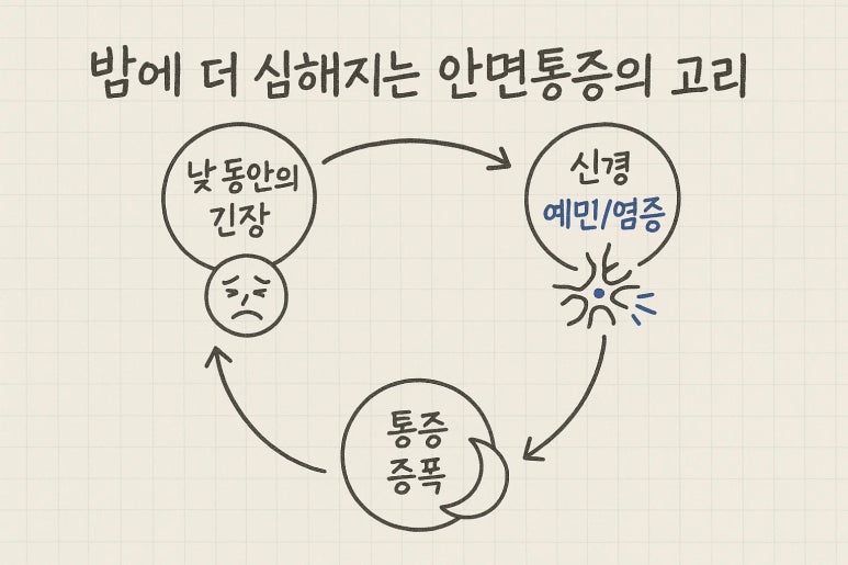 이 삼차신경통은 얼굴의 감각을 담당하는 3차 신경에 문제가 생겨 발생하는 질환인데, 왜 밤이 되면 더 고통스러운 걸까요?