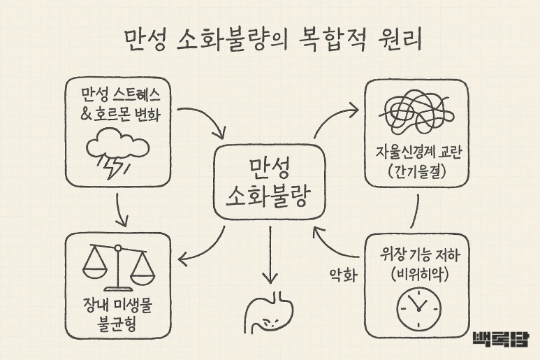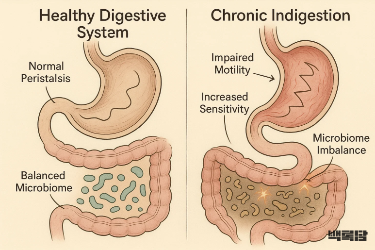 이러한 복합적인 요소들은 소화 기관의 민감도를 높이고, 위장 운동 기능을 저해하며, 장내 미생물 환경에도 부정적인 영향을 미쳐 ‘더부룩함’과 ‘답답함’ 같은 고질적인 소화불량 증상을 유발하게 됩니다.