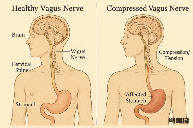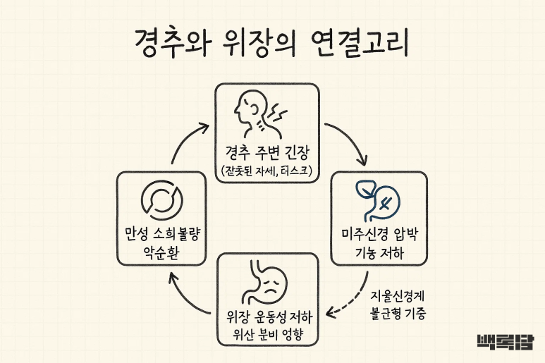 그렇다면 목디스크나 경추 주변의 긴장이 어떻게 소화불량으로 이어질 수 있을까요?